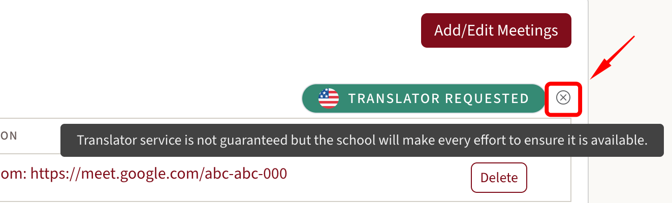 - If a parent does not require a translator, they must click the “X” (cross) next to the translator option to indicate that no translator is needed.